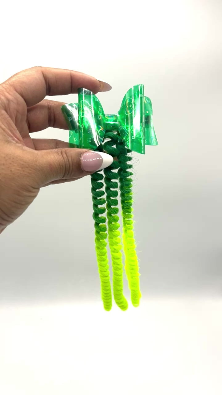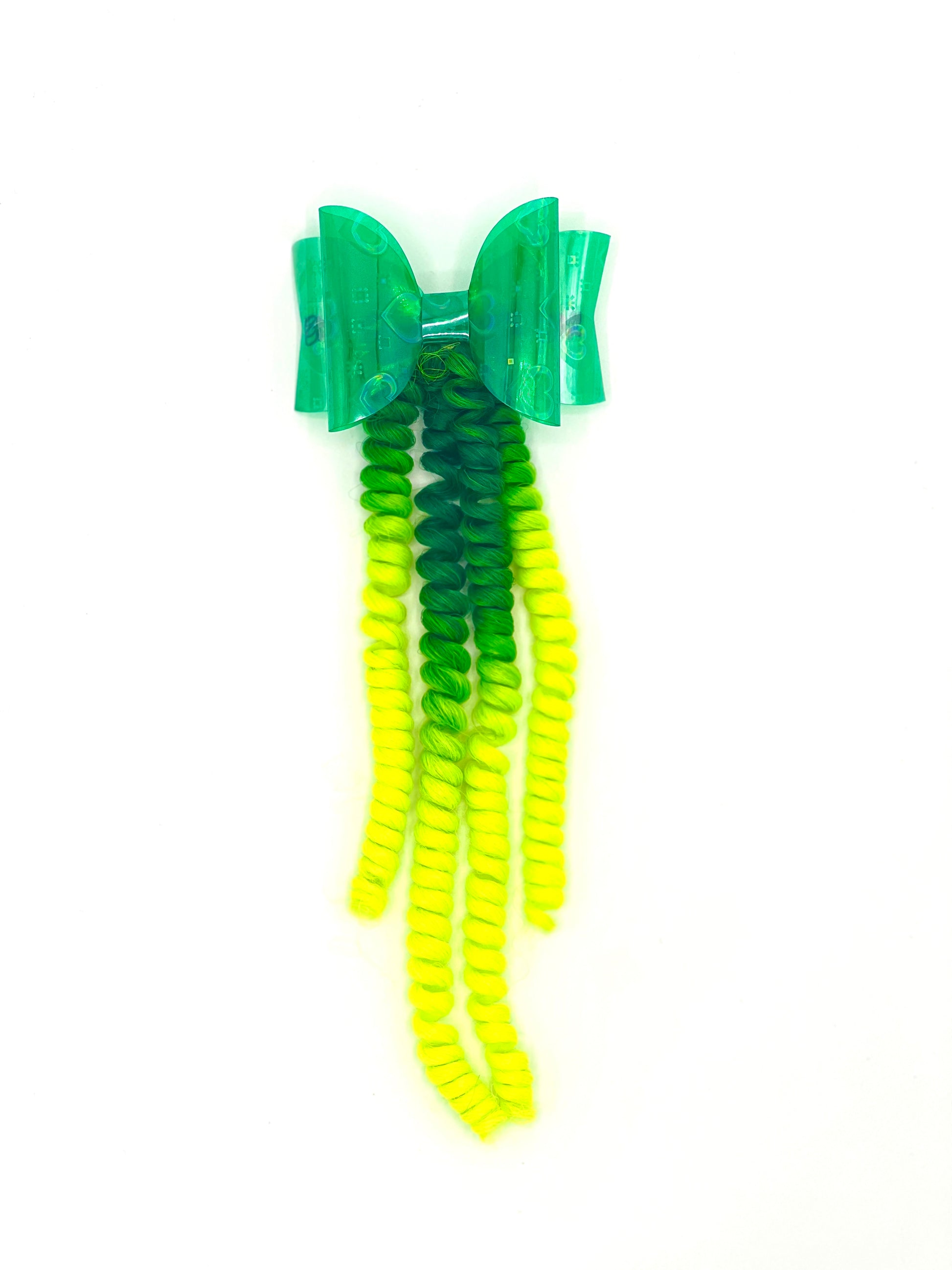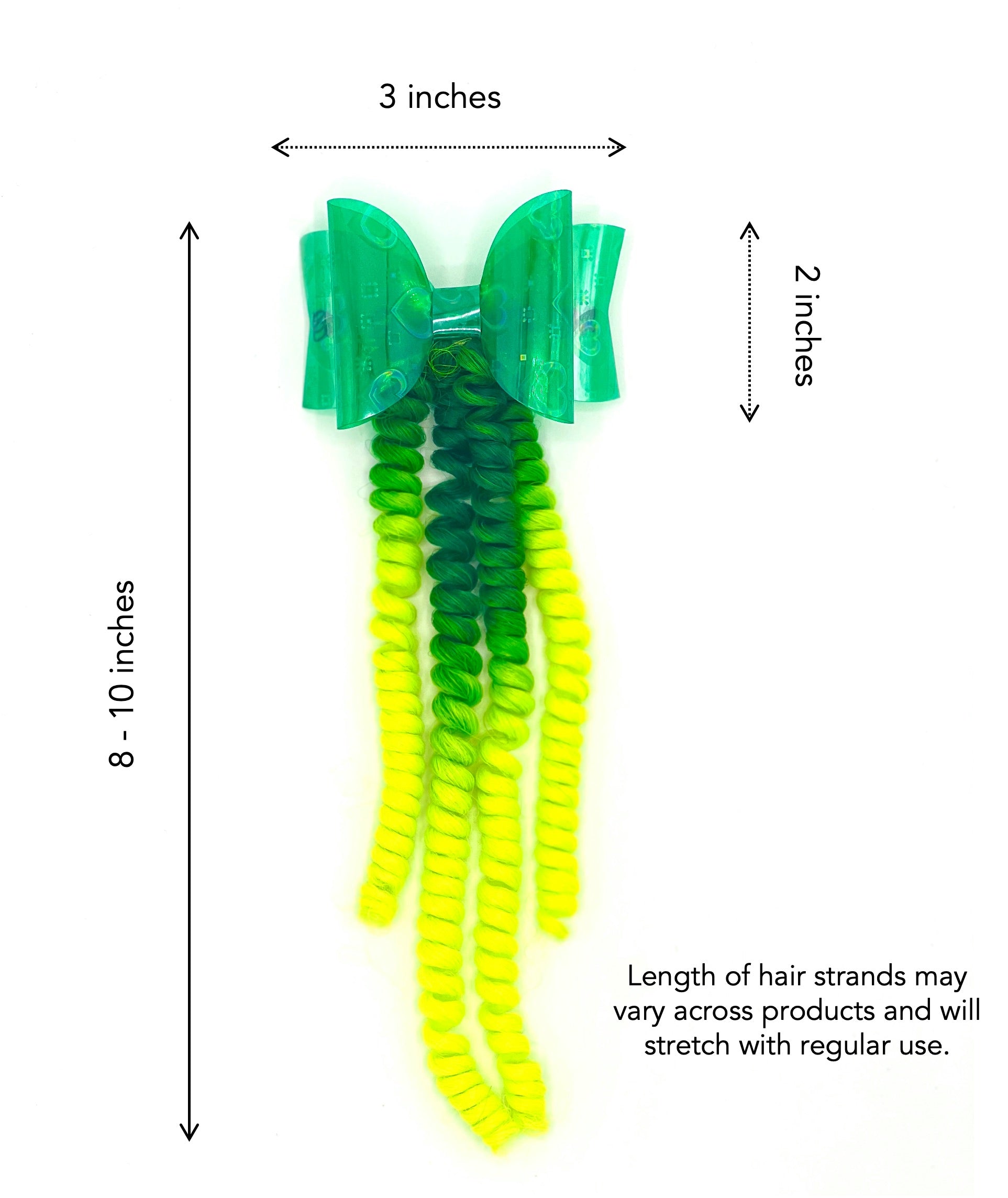 Shine bright with the FireFly CoilyClip™! Featuring soft and bouncy synthetic coily hair, attached to a transparent green bow, with two-color ombre effect: